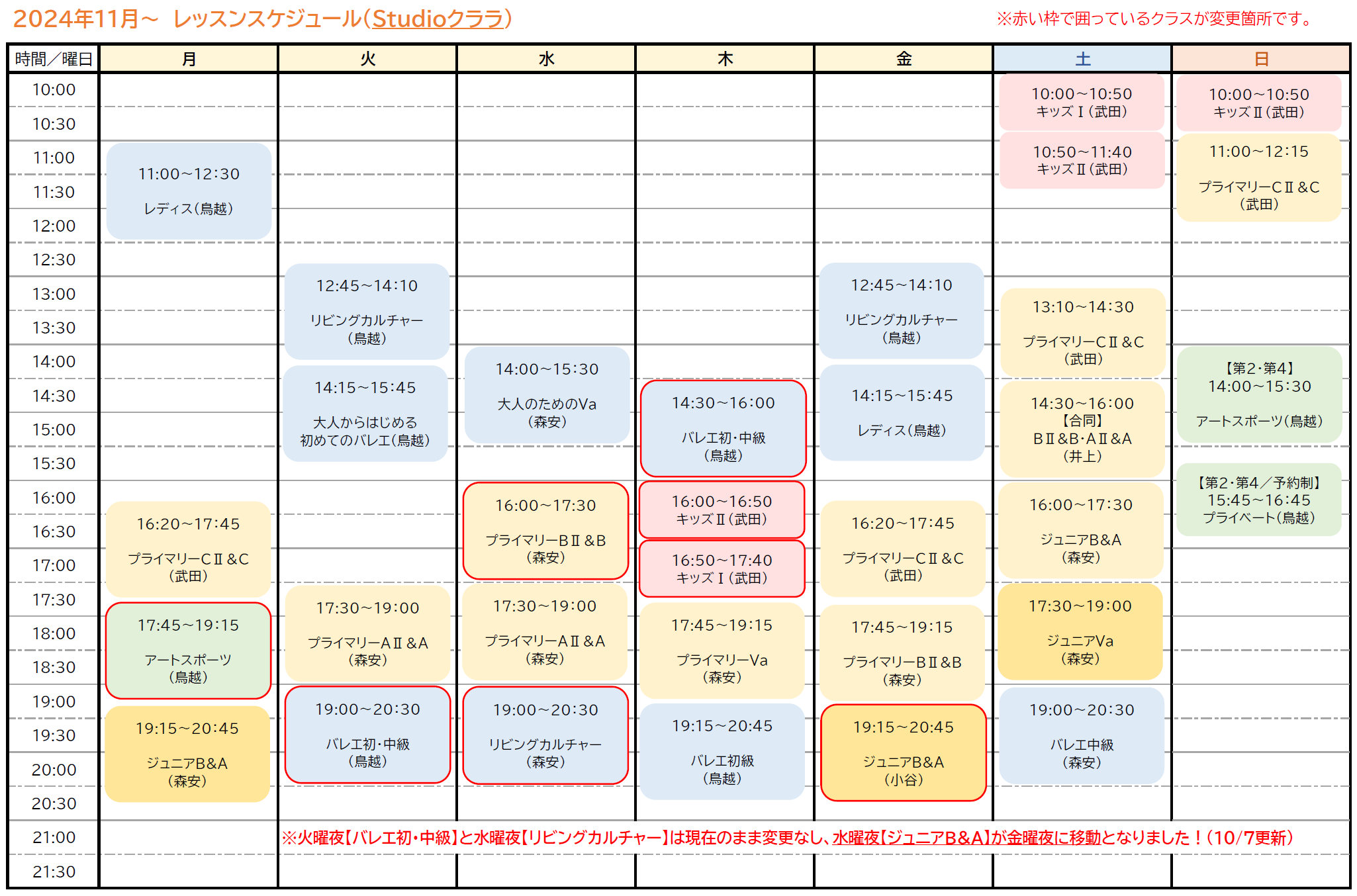 その他のクラスも少しスケジュールに変更がありますので、
